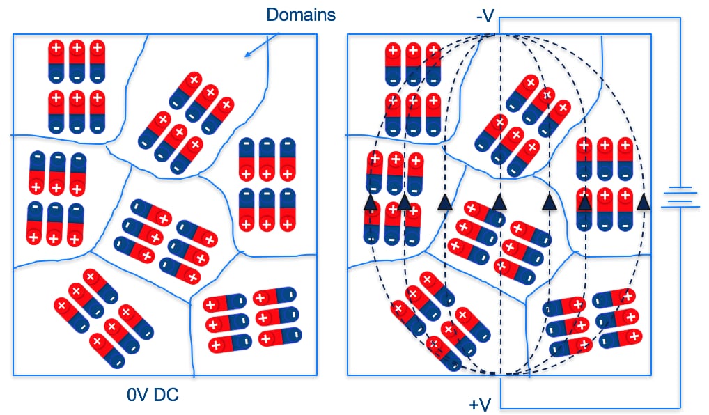 A simplified explanation for why this loss occurs is related to the electric dipoles in the dielectric material. The ceramic dielectric is composed of a crystalline structure that arranges those electric dipoles into separate domains (Figure 3). Spontaneous polarization of these domains occurs when no DC voltage is present. This polarization gives the dielectric material a high relative permittivity. (By the way, relative permittivity replaced the deprecated term “dielectric constant.”)