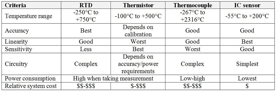 Table 1: The relative advantages and disadvantages of RTDs, thermistors, thermocouples and IC sensors