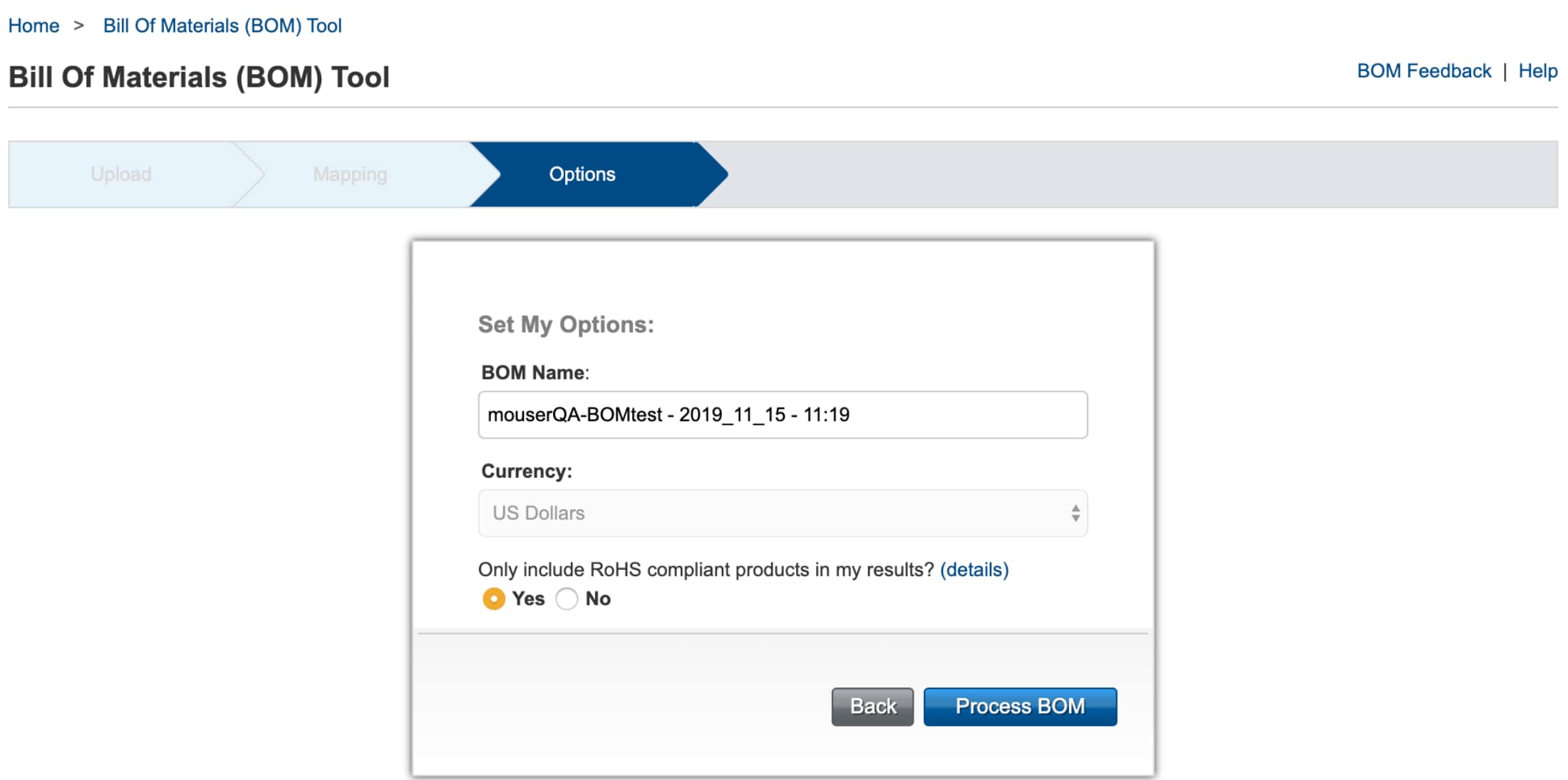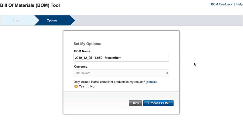 Seleccione el método deseado y la herramienta lo guiará por los pasos restantes para completar su BOM.