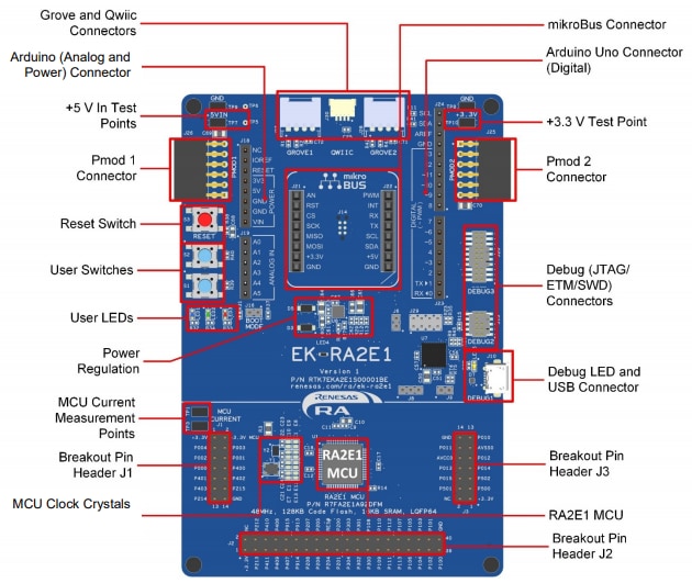 Renesas Electronics RA2E1 Evaluation Kit allows for evaluating the features of the RA2E1 MCUs. Develop embedded systems applications using Flexible Software Package (FSP) and e2 studio IDE. A set of rich onboard features along with a choice of popular ecosystem add-ons bring big ideas to life.Features